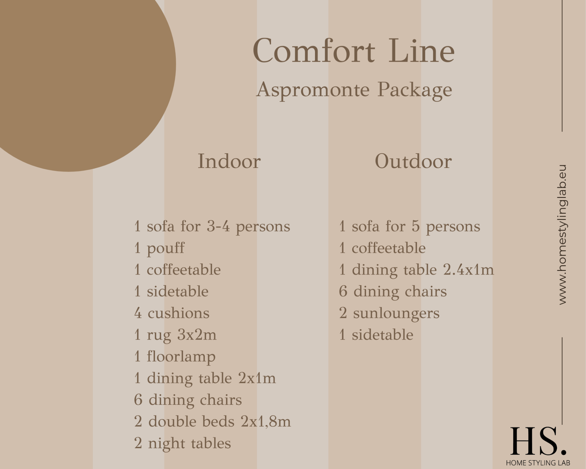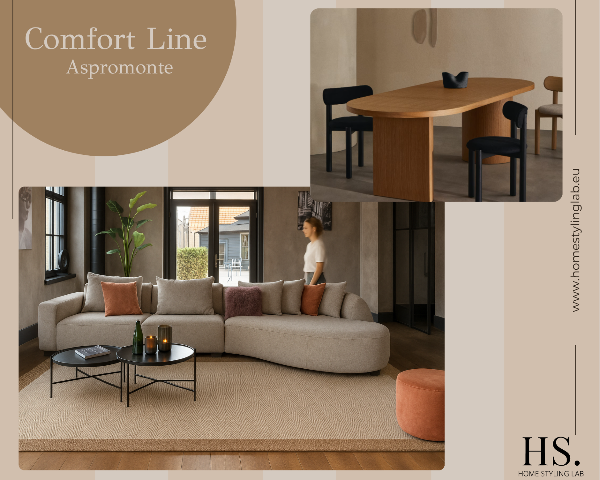 The Aspromonte line represents contemporary elegance with clean lines and cool graphite tones. Outside: stackable sun loungers, ceramic dining table and rope lounge set on slender frames. Inside: organic corner sofa, oval oak table and black accents with terracotta cushions. Package optimises rental value and comfort, including styling, delivery and assembly for MijnHuisInTropea, with service plan and warranty included.