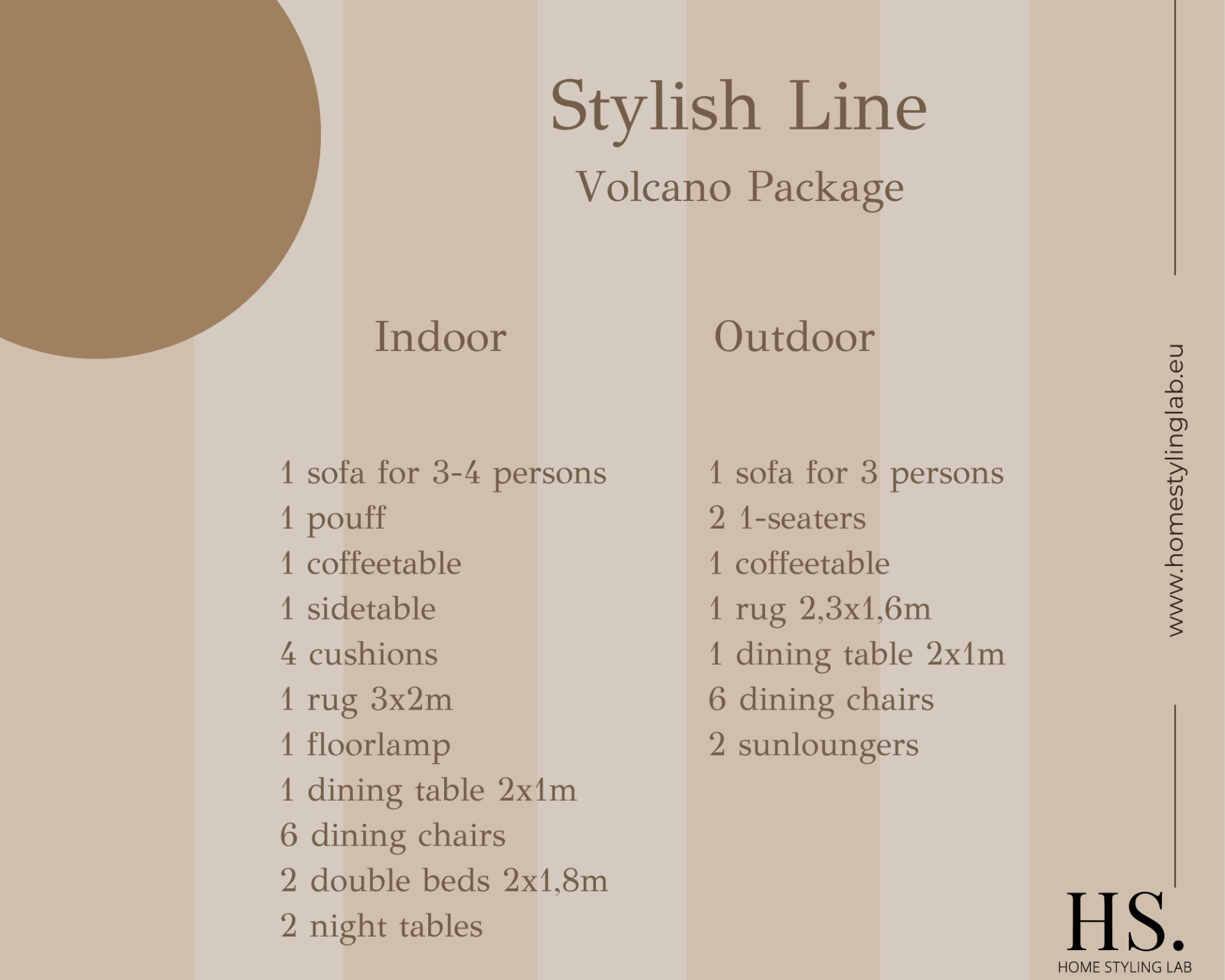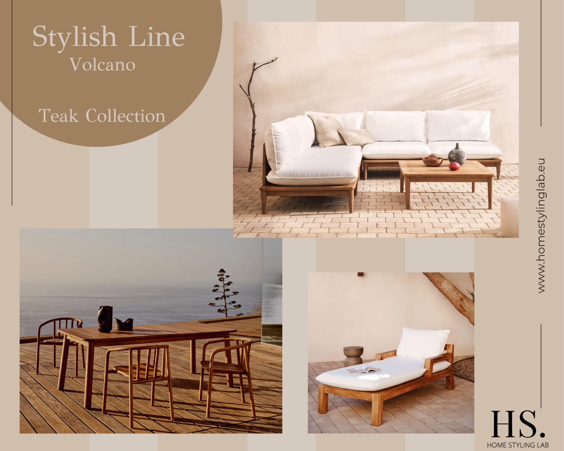 Stylish Line Volcano is the premium upgrade to Comfort—more exclusive, richer materials and details. Inside: oval ribbed-leg dining table in travertine, soft sofa with warm ochre accents, serene master bed. Outside: solid teak lounge set, teak table and luxurious teak sun loungers. Turnkey package for higher rental value: styling, delivery, assembly, service plan and warranty. Includes colour palette, easy-care fabrics and advice